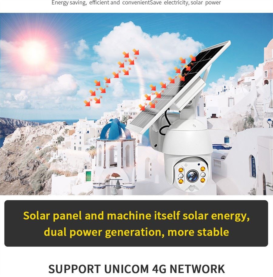 1. 100% Wireless & Solar Powered--- 4g zunanja vodoodporna Sončna kamera,100% brezžična in enostavna za namestitev. Brezžična varnostna kamera sončnega panela po 3 urah neposredna sončna svetloba podpira njeno porabo energije v enem dnevu. 6pcs polnilna vgrajena 18650 baterija do 20000mAh podaljša čas vzdržljivosti, lahko jo uporabljate in vam ni treba skrbeti za vreme. 365 dni Non-stop napajanje za zaščito vaše domače varnosti.