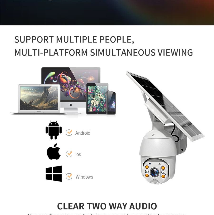 4. Kamera Pan Tilt Broader View & Remote Control---solar ptz zagotavlja 360° vodoravne in 120° navpične kote vrtenja. Podpira daljinsko upravljanje smeri v telefonu. S funkcijami 3x digitalne povečave in skupno rabo več uporabnikov, ki zagotavlja bolj prilagodljiv in širši pogled za vas in družine za spremljanje vaše hiše v vsem vidu v realnem času. Izbira sončne zunanje kamere ščiti vaš dom 24/7.